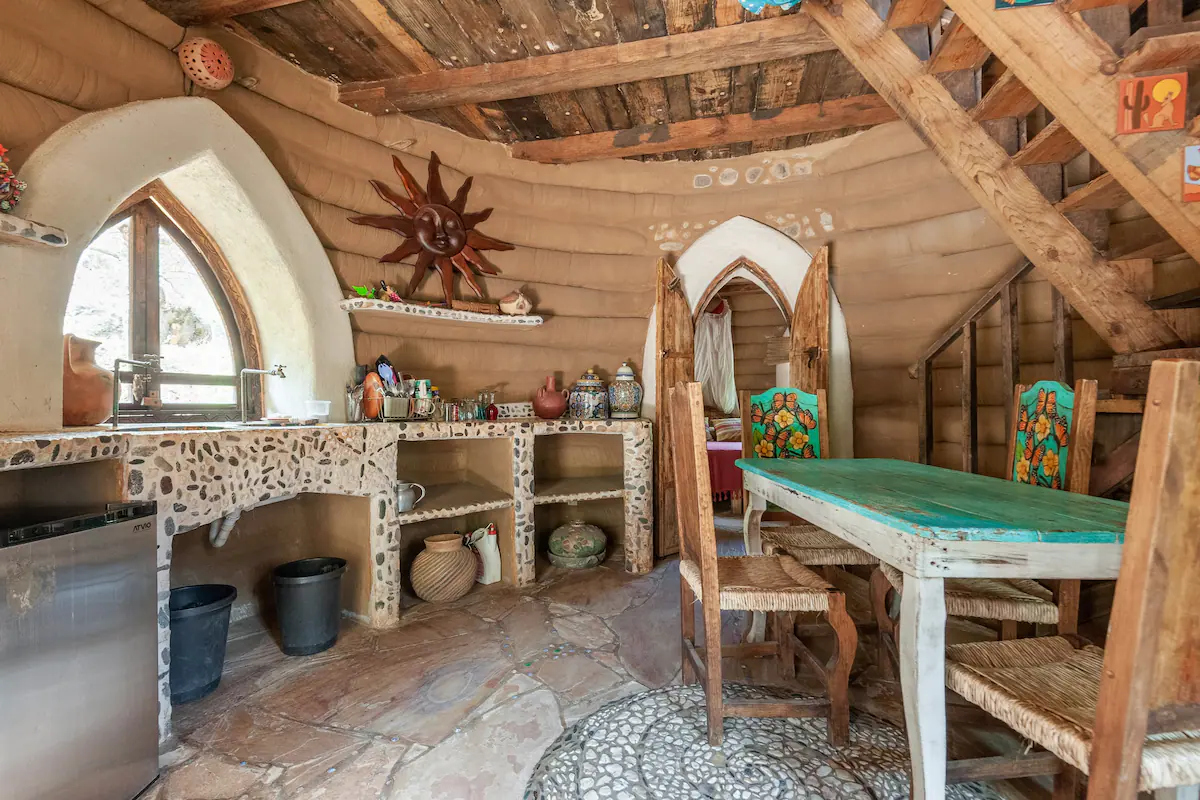 Esta cabaña sacada de un cuento duendesco nos remite al interior de un caracol. Casa Caracol es una cabaña de Superadobe conformada por dos domos. Desde sus terrazas podrás observar las estrellas, las formaciones milenarias de La Puerta, La Ventana, la cabeza de Quetzalcóatl, el cerro de Los Guardianes y el de La Mujer-Mariposa. Cuenta con baño completo, asador para carne, calentador de agua solar, cocineta, terraza interior y terraza exterior privadas. Ocho huéspedes, tres habitaciones (la primera con una cama King size, una cama individual y una hamaca; la segunda con una cama matrimonial y una cama individual; y la tercera con un sofá cama).